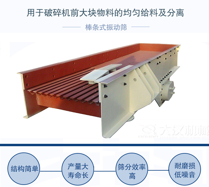 BTS棒條式振動(dòng)篩用于破碎機(jī)前大塊物料的均勻給料及分離,棒條式振動(dòng)篩特別適用于水電行業(yè)、建筑石料及黑色或有色金屬、礦石粗破前給料和初篩;棒條式振動(dòng)篩振動(dòng)給料機(jī)采用振動(dòng)電機(jī)為激振源,結(jié)構(gòu)簡(jiǎn)單、維護(hù)方便;產(chǎn)量大,壽命長(zhǎng),結(jié)實(shí)耐用。
