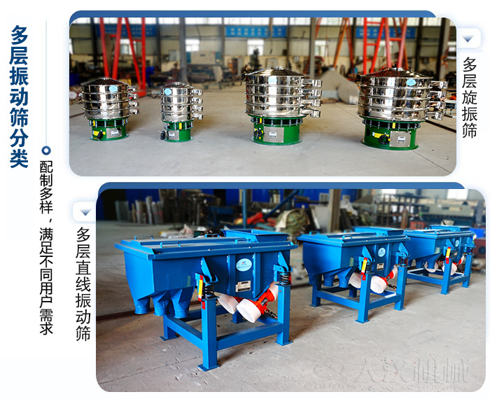 多層振動篩可用于粉末,顆粒,液體物料篩分和分級,篩網有2-6層可選,可將物料篩分成3-6種不同規格粒度,分多層直線振動篩和多層旋振篩,材質有碳鋼,不銹鋼,塑料可選。