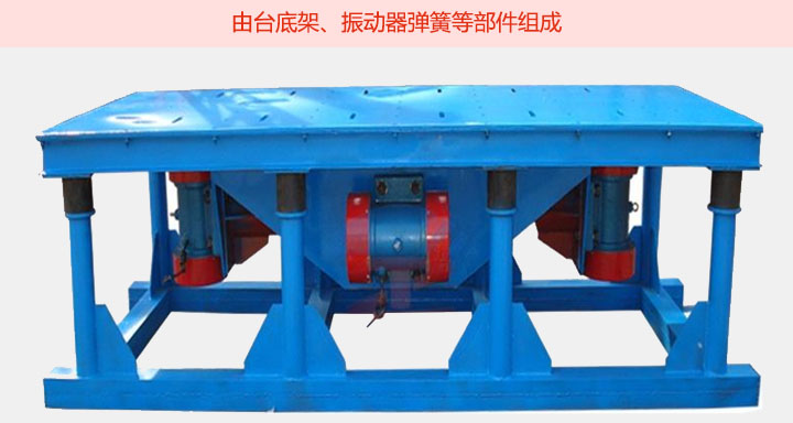 混凝土振動臺主要由臺底架、振動器彈簧等部件組成,臺面與底架均用鋼板和型鋼焊接而成,振動臺是用電動機(jī) 加一對相同的偏心輪組成。并通過一對吊架聯(lián)軸器安裝在臺面(反面)中心位置,起著振實過程中平穩(wěn)、垂直方向的作用。