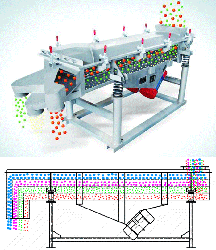多層直線振動篩利用雙臺電機作為振動源,物料在篩網上受激振力的作用被拋起,同時向前做直線運動,物料從給料機均勻地進入直線篩進料口后,通過多層篩網產生了數種不同規格的篩上物、篩下午,后分別又從各自的出口排出。